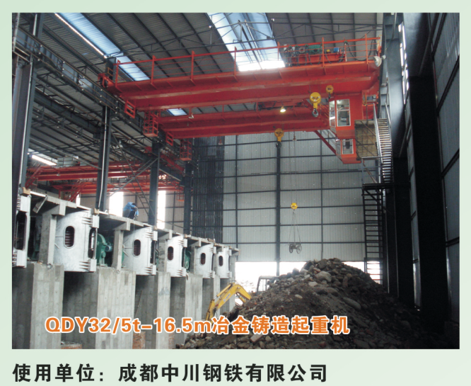 铸造起重机是冶炼车间的主要生产设备之一,该起重机设有独立驱动的主副小车,转户口钩配置固定间距 的龙门吊钩、吊运钢包,副钩可用来倾翻钢包或做其它辅助性的吊运作业,铸造起重机采用安全可靠的起 升机构,并可在司机室和车间赤示出所吊物之重量,该机采用封闭型的偏轨箱型梁,因此具有良好的垂直 和水平刚性。